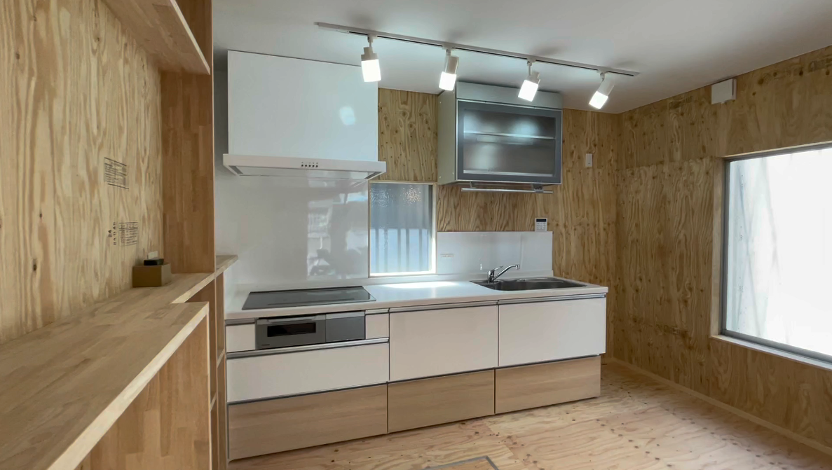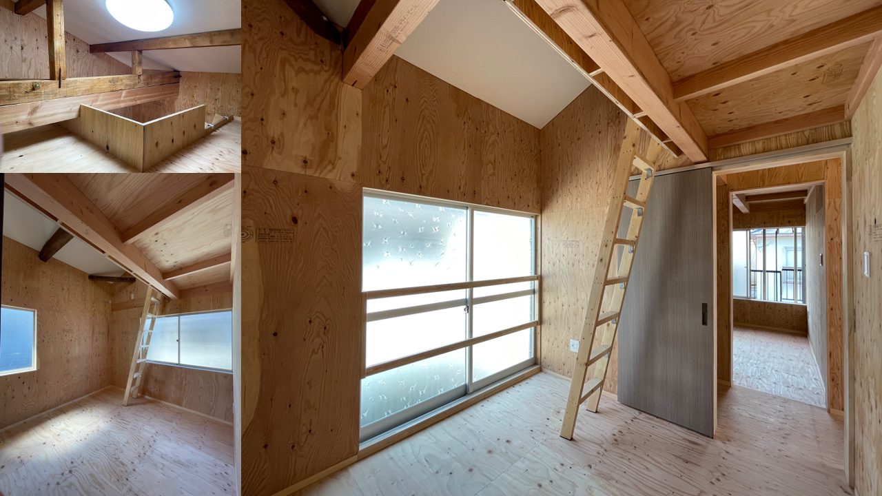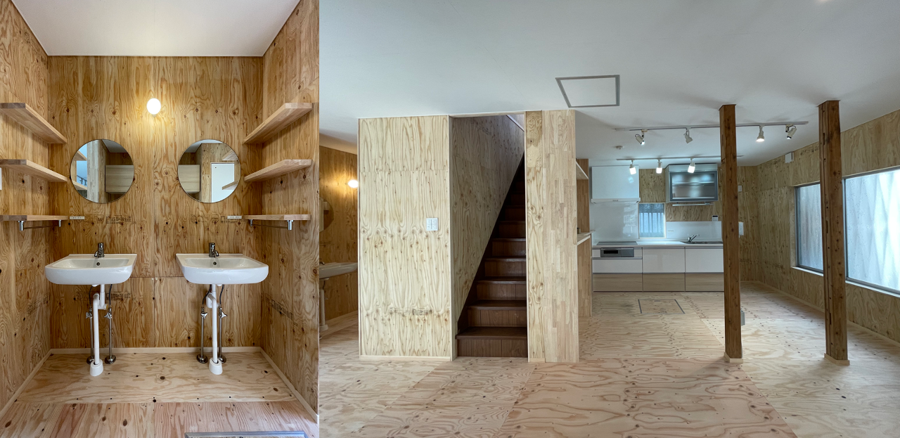 基礎、はりや柱、階段や収納など使える素材は残して解体したのち、耐震改修を行い、1階部分はすべてコモンスペースとしており、広いダイニングキッチン、玄関土間リビング、水回りからなり、2階部分は4部屋ともロフト付きの個室からなるプライベートゾーンとしています。
